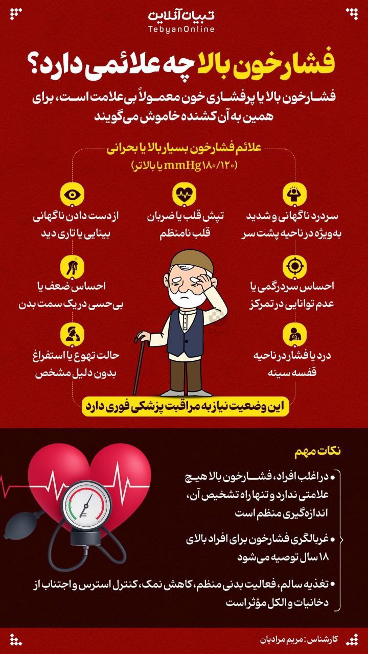 4040406094 ۴ نظر، ۰ در صف انتشار و ۱ تکراری یا غیرقابل انتشارفشار خون بالا یا پرفشاری خون معمولاً بدون علامت است و به همین دلیل به آن «کشنده خاموش» میگویند. با این حال، در مواردی که فشارخون به شدت بالا میرود، ممکن است علائمی بروز کند