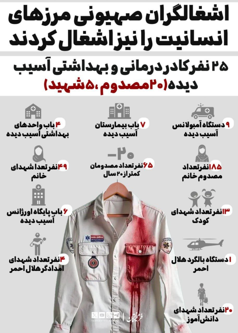 4040410028طبق اعلام وزارت بهداشت و براساس آمار دانشگاههای علوم پزشکی سراسر کشور از تعداد مجروحان و شهدای جنگ ۱۲ روزه و حملات اسراییل به ایران، نفر از مجروحان و شهدا، از کادر درمان (۵ شهید و ۲۰ مجروح) بودهاند.