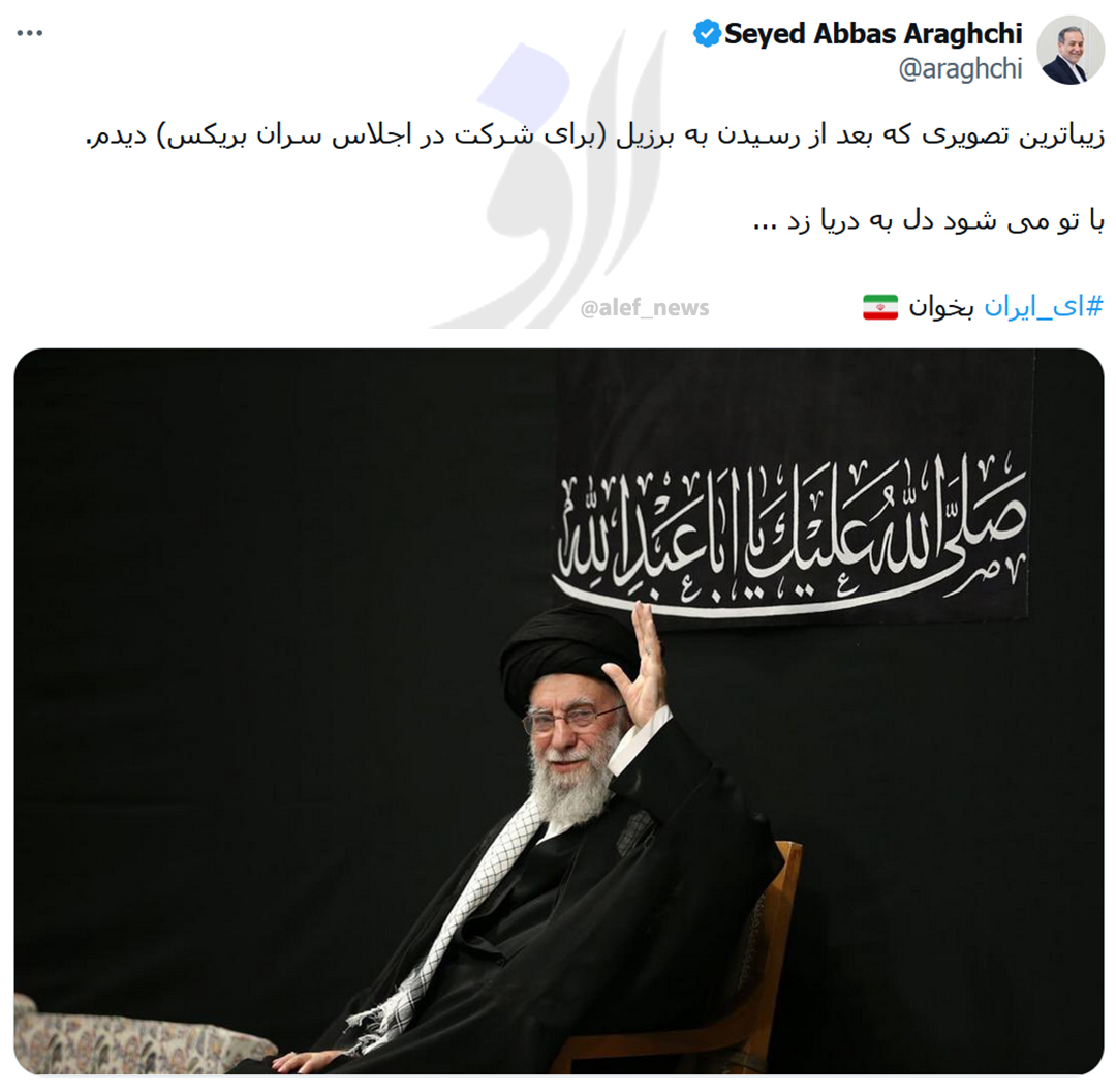 4040415021سیدعباس عراقچی وزیر امور خارجه در شبکه اجتماعی ایکس تصویری از رهبر انقلاب منتشر کرد و نوشت: زیباترین تصویری که بعد از رسیدن به برزیل (برای شرکت در اجلاس سران بریکس) دیدم. عراقچی اضافه کرد: با تو میشود دل به دریا زد...