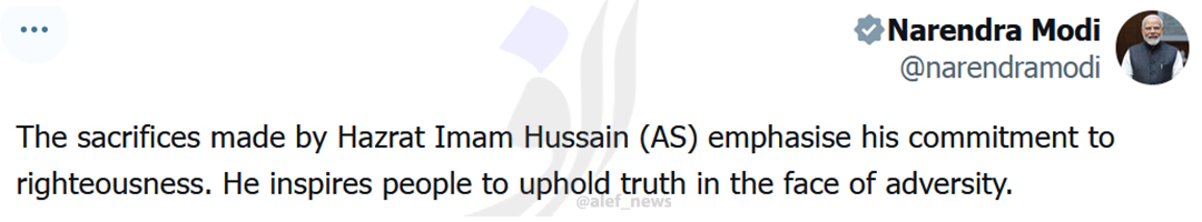 4040415069 ۲ نظر، ۰ در صف انتشار و ۰ تکراری یا غیرقابل انتشارنارندرا مودی، نخست وزیر هند با تمجید از شخصیت امام حسین (علیهالسلام)، ایشان را نماد ایستادگی بر حق در برابر ظلم توصیف کرد و در ایکس نوشت: فداکاریهای حضرت امام حسین (علیهالسلام) تعهد او به راستی را برجسته میسازد. او الهامبخش مردم است تا در برابر سختیها، از حقیقت دفاع کنند.