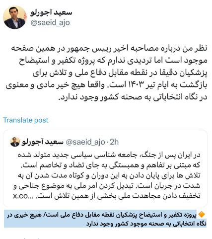 سعید آجورلو کارشناس سیاسی نوشت : درباره مصاحبه آقای پزشکیان با کارلسون باید منصفانه سخن گفت. نکات مثبت داشت و چند نکته قابل نقد؛