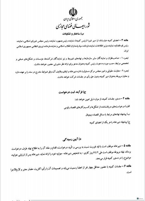 این مصوبه در جلسه ۲۳ بهمن ماه سال ۱۴۰۳ شورای عالی فضای مجازی تصویب و در ۱۳ خرداد ۱۴۰۴ هم جهت اجرا ابلاغ شد و بر اساس مصوبه در صورتی که تشکلهای رسمی اقتصاد دیجیتال کشور نسبت به هر یک از اقدامها و تصمیمهایی که موجب اخلال جدی در فعالیت آنها است، اعتراضی را به دبیرخانه شورای عالی فضای مجازی ارجاع دهند، با حضور دبیر شورای عالی فضای مجازی و نمایندگان رئیس جمهور، رئیس مجلس شورای اسلامی، رئیس قوه قضائیه، وزیر اطلاعات، فرمانده سپاه، فرمانده فراجا و در صورت لزوم دستگاههای مربوطه این کمیته تشکیل جلسه داده و پس از بررسی موضوع، تصمیمات لازم را برای تسهیل فعالیت فعالان این حوزه میگیرد.