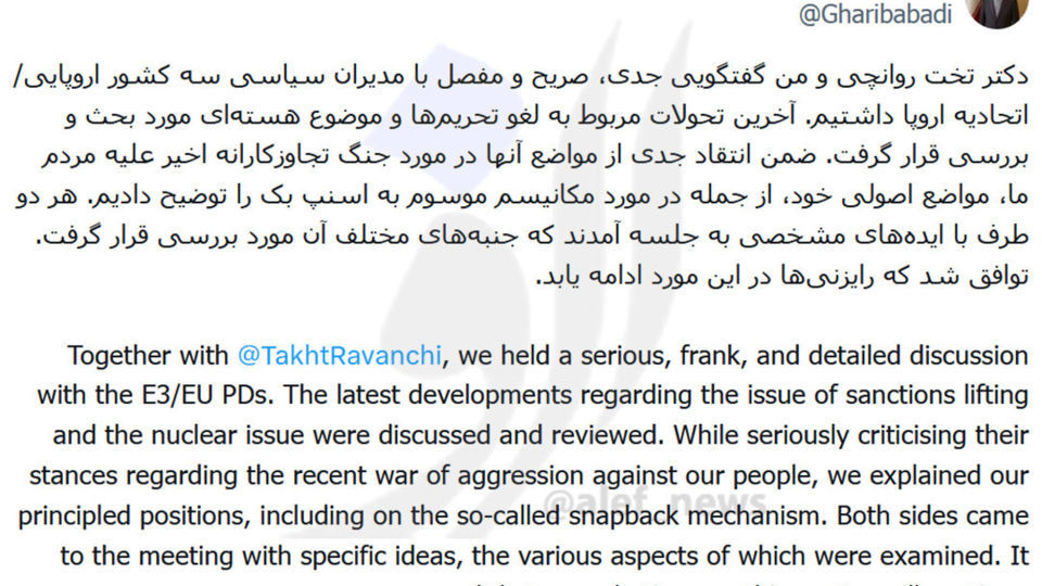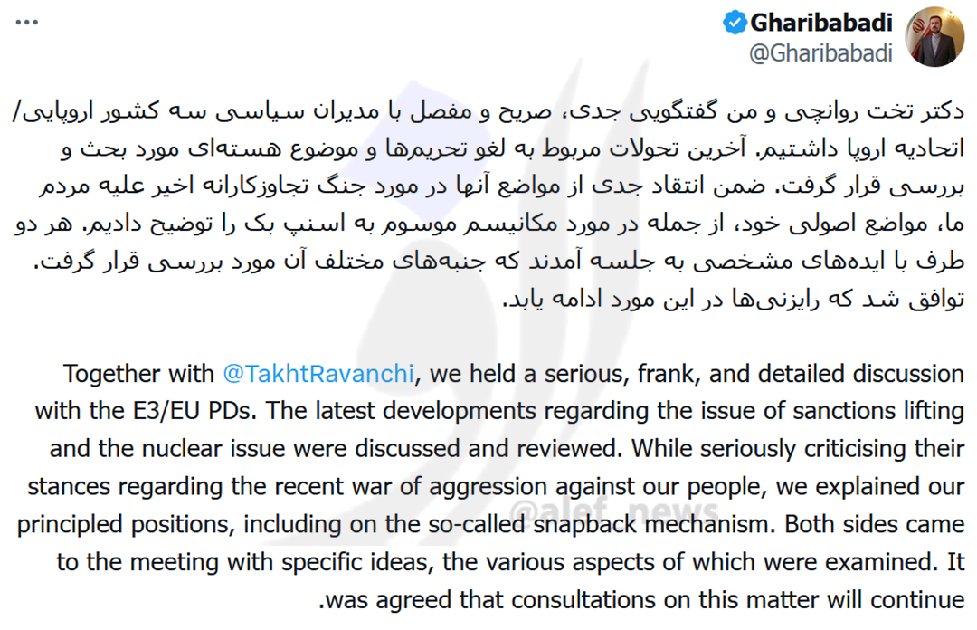 غریبآبادی: مذاکرات با اروپا صریح و مفصل بود/ توافق شد رایزنیها ادامه یابد