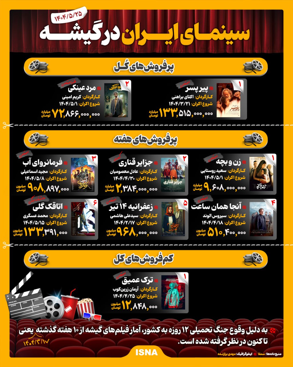 4040525066دو فیلم سینمایی «پیر پسر» و «مرد عینکی» از زمان اکران روی پرده سینما تا صبح امروز، عنوان پرفروشترین فیلمها را برای خود ثبت کردهاند. همچنین در طول یک هفته گذشته چهار فیلم سینمایی روی پرده نیز آمار پرفروشترینهای هفته گذشته را از آن خود کردند. به دلیل وقوع جنگ تحمیلی ۱۲ روزه در کشور، آمار فیلمهای گیشه از ۱۰ هفته گذشته یعنی (۱۷ خرداد ۱۴۰۴) تا کنون درنظر گرفته شده است.