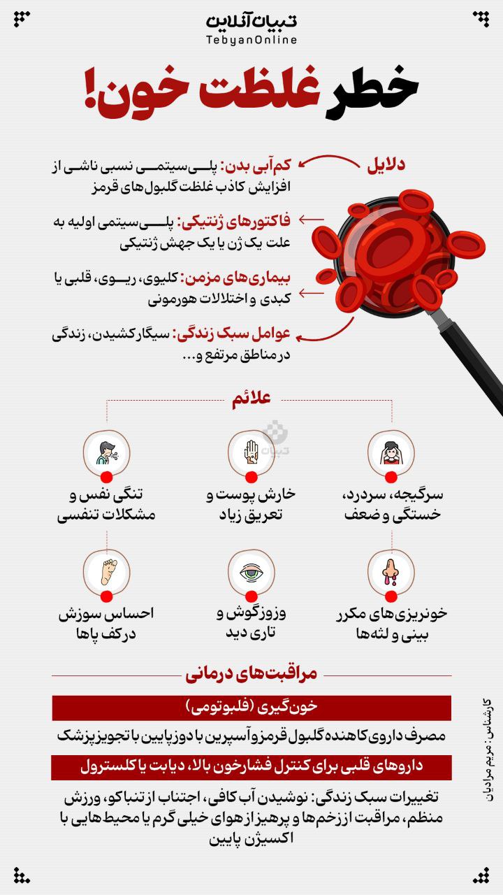 4040527069غلظت خون (پلیسیتمی) به افزایش گلبولهای قرمز خون گفته میشود که میتواند موجب بزرگی طحال، لختهشدن خون، آنژین، سکته مغزی، بیماری قلبی، اختلالات خونی و... شود