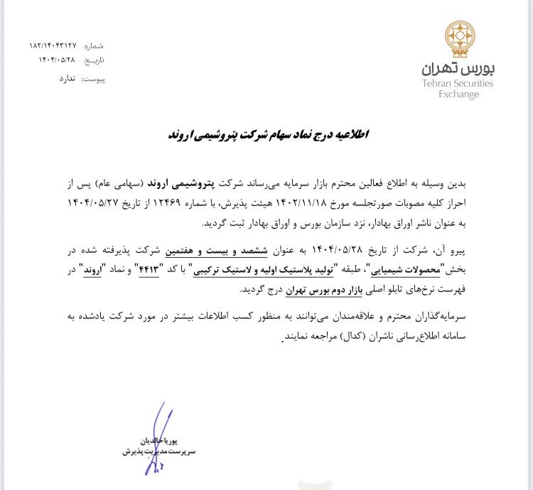 شرکت پتروشیمی اروند (سهامی عام) با نماد «اروند» پس از اخذ مجوزهای قانونی و تصویب هیئت پذیرش، از تاریخ ۲۸ مرداد ۱۴۰۴ در بازار بورس اوراق بهادار تهران درج شد.