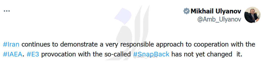 4040610035اولیانوف در واکنش به اظهارات محمد اسلامی، رئیس سازمان انرژی اتمی درباره حضور دو بازرس آژانس بینالمللی در ایران و نظارت بر فرایند تعویض سوخت نیروگاه اتمی بوشهر، نوشت: ایران همچنان در قبال همکاری با آژانس بینالمللی انرژی اتمی، رویکردی بسیار مسئولانه نشان میدهد. اقدامات تحریکآمیز تروئیکای اروپایی (E۳) با به اصطلاح «اسنپبک»، هنوز این (رویکرد) را تغییر نداده است.