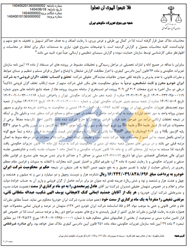 به گزارش خبرگزاری فارس؛ سازمان تعزیرات حکومتی در رأیی بدوی اعلام کرد که گرانفروشی ایرانخودرو محرز است. بر اساس این حکم: افزایش قیمت محصولات ایرانخودرو تنها تا سقف ۱۵ درصد نسبت به نرخهای قبلی مجاز شناخته شده و مازاد آن گرانفروشی محسوب میشود.این شرکت موظف است دو برابر سود ناشی از گرانفروشی، معادل ۱۶۲۴ میلیارد تومان جریمه پرداخت کند.عادل پیرمحمدی، مدیرعامل ایرانخودرو، به مدت دو ماه از سمت خود برکنار خواهد شد.چهار عضو هیأتمدیره شامل جمشید ایمانی، یوسفالهی شکیب، عبدالله سلطانی ثانی و مرتضی شفیعی نیز هر کدام به یک ماه برکناری از سمت خود محکوم شدهاند.این رأی هنوز نهایی نیست و قابلیت تجدیدنظرخواهی دارد.