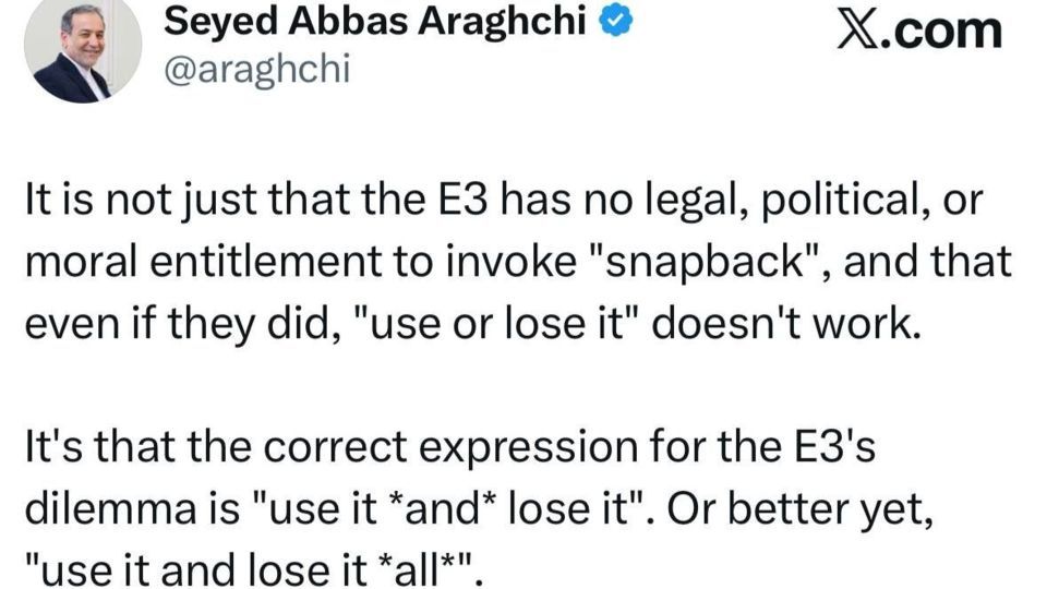 عراقچی اشاره داشت: تعبیر دقیقتر برای دوراهی سخت پیش روی سه کشور اروپایی آن است که «استفاده کنی از دستت رفته» و شاید بهتر باشد بگوییم: «استفاده کنی همه چیز از دستت رفته.»