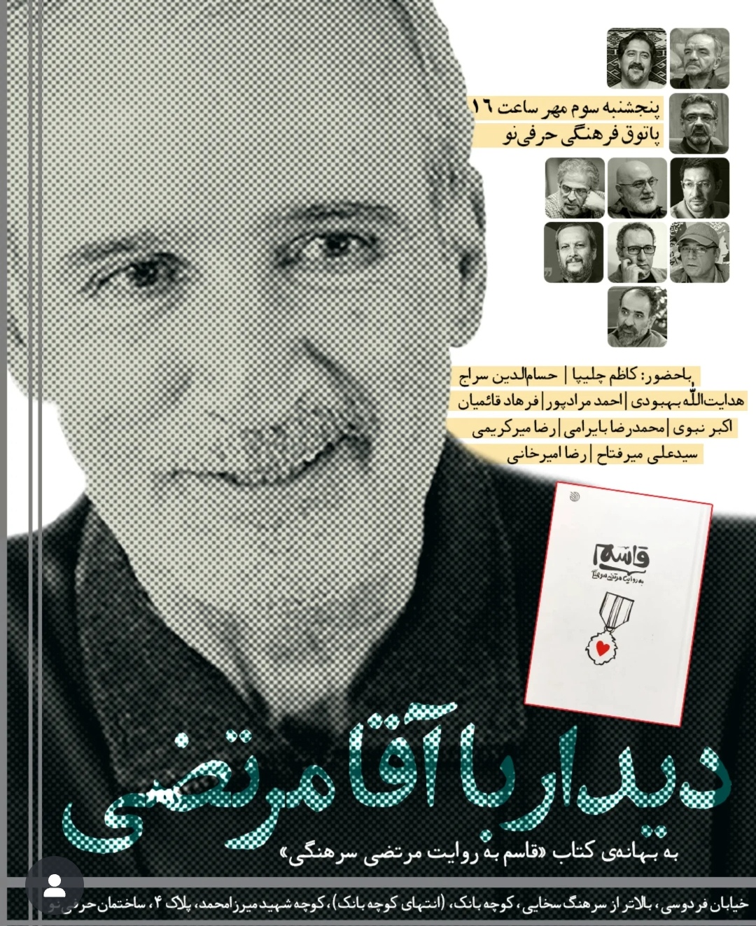 در این محفل که پنجشنبه سوم مهر ساعت ۱۶ به بهانهی انتشار کتاب "قاسم به روایت مرتضی سرهنگی" دایر میشود، کاظم چلیپا، حسامالدین سراج، هدایتالله بهبودی، احمد مرادپور، فرهاد قائمیان، اکبر نبوی، محمدرضا بایرامی، رضا میرکریمی، سیدعلی میرفتاح و رضا امیرخانی دربارهی مرتضی سرهنگی و کتاب تازهی او سخنانی را با حاضران در میان خواهند گذاشت.