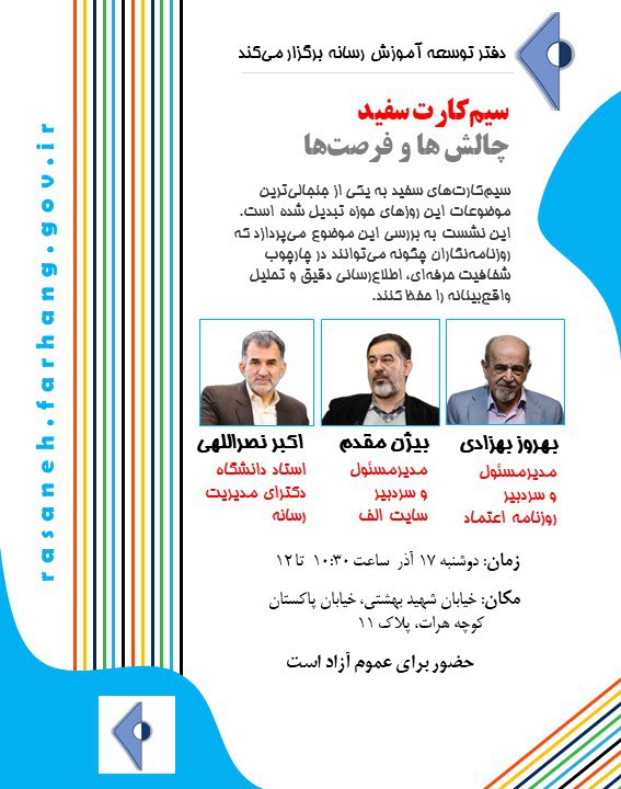 به گزارش الف، این نشست با حضور آقایان بهروز بهزادی مدیر مسئول و سردبیر روزنامه اعتماد، دکتر اکبر نصراللهی استاد دانشگاه و رئیس دانشکده علوم اجتماعی ارتباطات و رسانه و بیژن مقدم مدیر مسئول سایت تحلیلی و خبری الف در سالن شهدای رسانه این دفتر برگزار میشود.