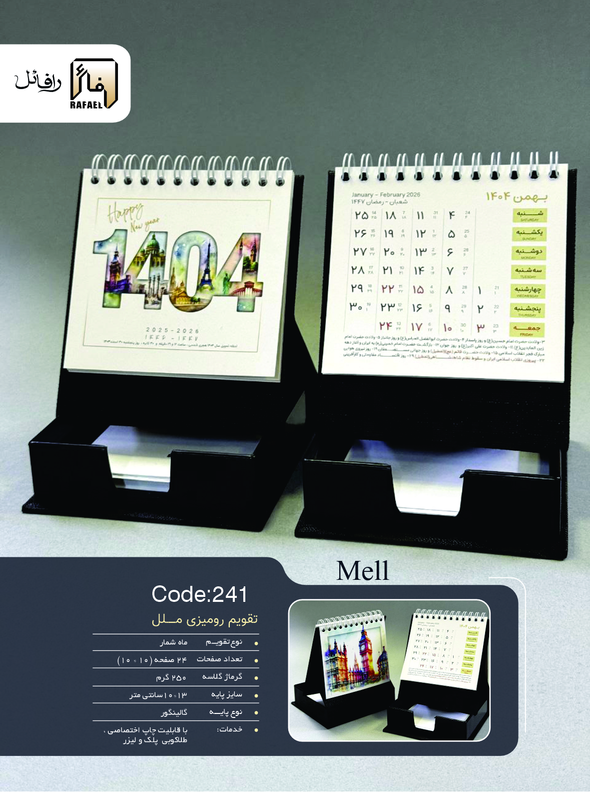 تقویم رومیزی ابزاری برای پیگیری تاریخ و مناسبتها است. این ممحصول میتواند مثل عنصر تبلیغاتی مؤثر عمل کند. با نزدیک شدن به سال جدید، تقاضا برای خرید تقویم رومیزی افزایش مییابد. شرکت رافائل با تمرکز بر کیفیت بالا و طراحیهای متنوع، تقویمهای رومیزی 1405 را در مدلهای پایهدار، با یادداشت، لاکچری و مدیریتی عرضه میکند.