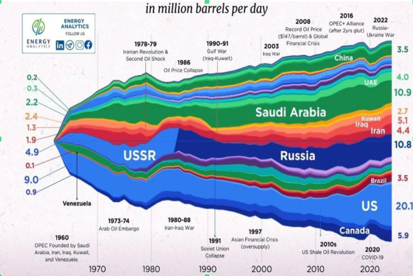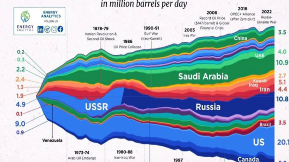 شصت سال گذشته تصویری پرنوسان و پیچیده از بازار جهانی نفت ارائه میدهد؛ بازاری که در آن تولید جهانی از حدود ۲۰ میلیون بشکه در روز در دهه ۱۹۶۰ به بیش از ۱۰۰ میلیون بشکه در دهه ۲۰۲۰ رسیده و این رشد حاصل پیشرفتهای فنآورانه و شوکهای متعدد ژئوپولیتیکی بوده است.