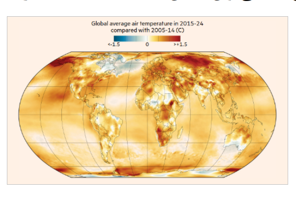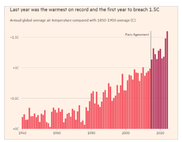 شکل 1. تغییر میانگین جهانی دمای هوا از سال 2015 تا 2024
