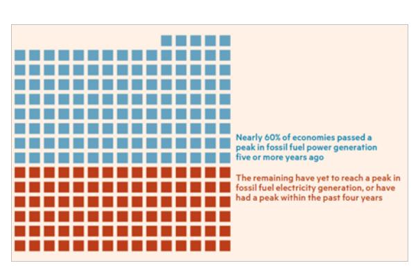 شکل 2. 60 درصد از اقتصادهای جهان قبل از 5 سال پیش از قله تولید برق فسیلی خود گذشتهاند، درحالی که باقی کشور ها یا از آن نگذشته اند یا بیش از 5 سال از گذشتنشان از آن سپری نشده است.