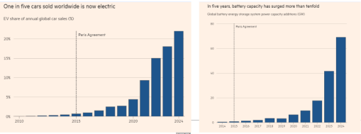از نگاه گذار به منابع تجدید پذیر، مجموع ظرفیت نصبشده انرژی خورشیدی الآن بیش از چهار برابر مقداری است که در سال ۲۰۱۵ پیشبینی شده بود و وضعیت برای انرژی بادی هم مشابه است. فروش خودروهای برقی نیز به بیش از ۲۰ درصد از کل فروش خودروهای جدید جهان رسیده (شش سال زودتر از پیشبینیها) که یکی از دلایل غافلگیرکننده بودن این روند برای کارشناسان، کاهش بسیار سریع هزینه فناوریهای سبز همزمان با ترویج آنها بود. این امر رشد انرژی پاک را برای کشورهای مختلف آسانتر کرد.