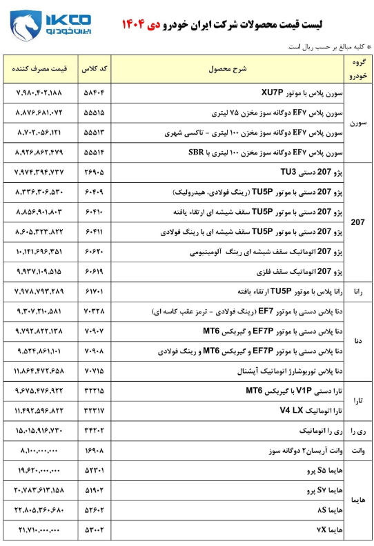 شرکت ایران خودرو لیست قیمت کلیه محصولات تولیدی خود را ویژه دی ماه 1404 برای اطلاع عموم منتشر کرد.