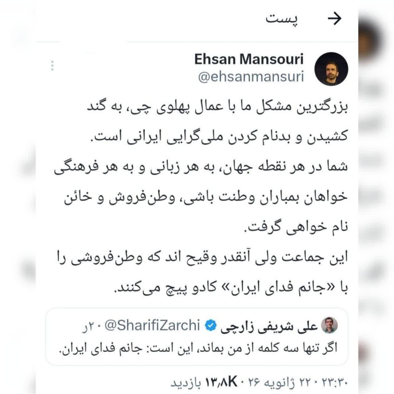 ایران دوستی زارچی هم دقیقا به همین شکل است او در کنار پهلوی ها از بمباران آمریکایی و حمله به ایران دفاع میکند با نام ایران دوستی! زارچی مصداق بارز همان وضعیت است او در حال عادی سازی حمله به وطن است با ژست ایران دوستی! این آخرین مرحله از شیادی و کلاه برداری واژهها است که امثال زارچی آن را شروع کردهاند.