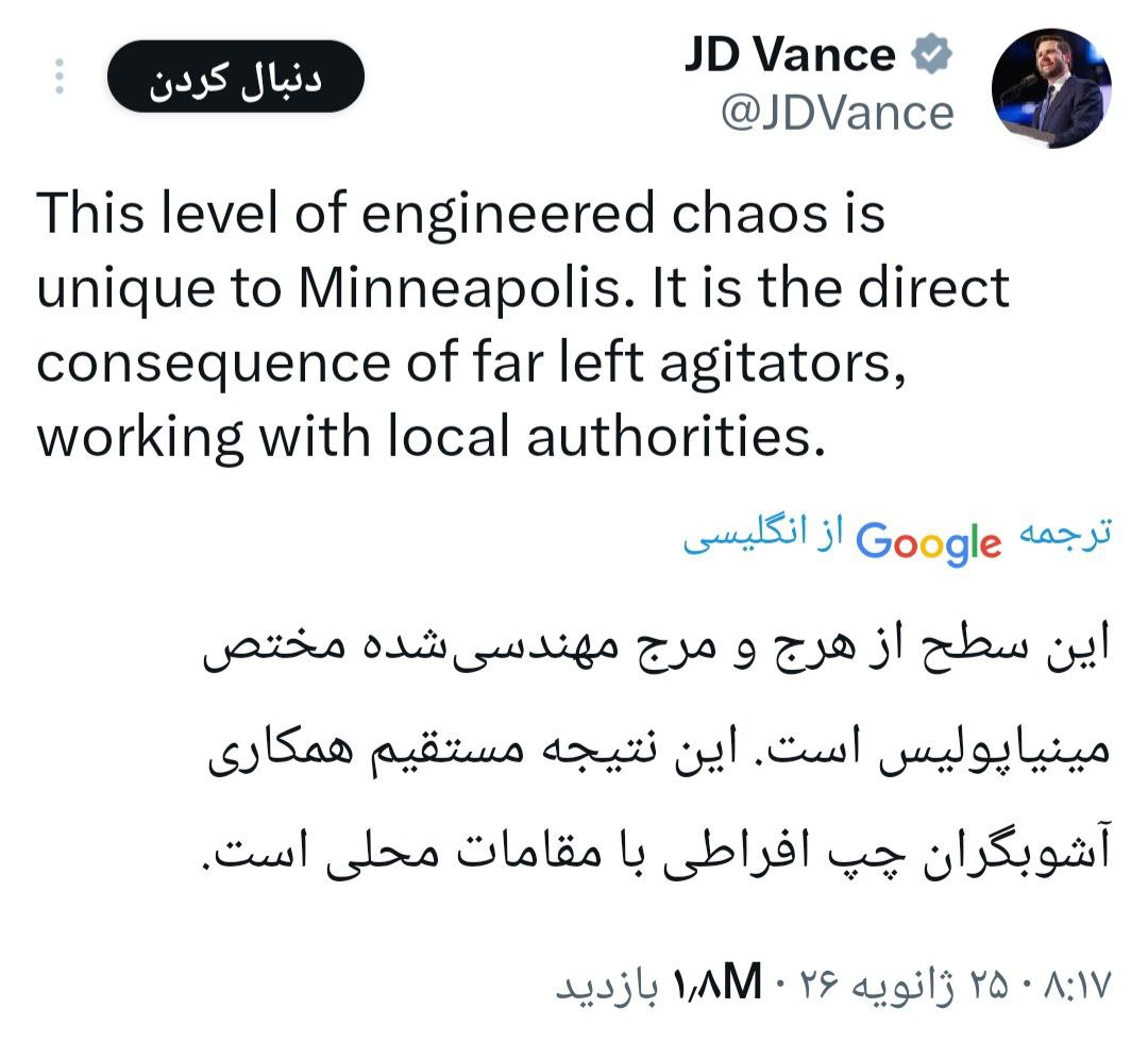 جیدی ونس در جدیدترین موضعگیری خود نسبت به این موضوع، اعتراضات را برنامهریزی شده توسط آشوبگران چپ افراطی با هماهنگی با مقامات محلی دانسته است.