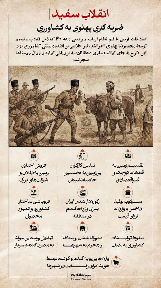 4041107029 ۳ نظر، ۱ در صف انتشار و ۵ تکراری یا غیرقابل انتشاراصلاحات ارضی یا لغو نظام ارباب و رعیتی دهه ۴۰ که ذیل انقلاب سفید و توسط محمدرضا پهلوی اجرا شد، تیر خلاصی بر اقتصاد سنتی کشاورزی بود. این طرح به جای توانمندسازی دهقانان، به فروپاشی تولید و زوال روستاها منجر شد.