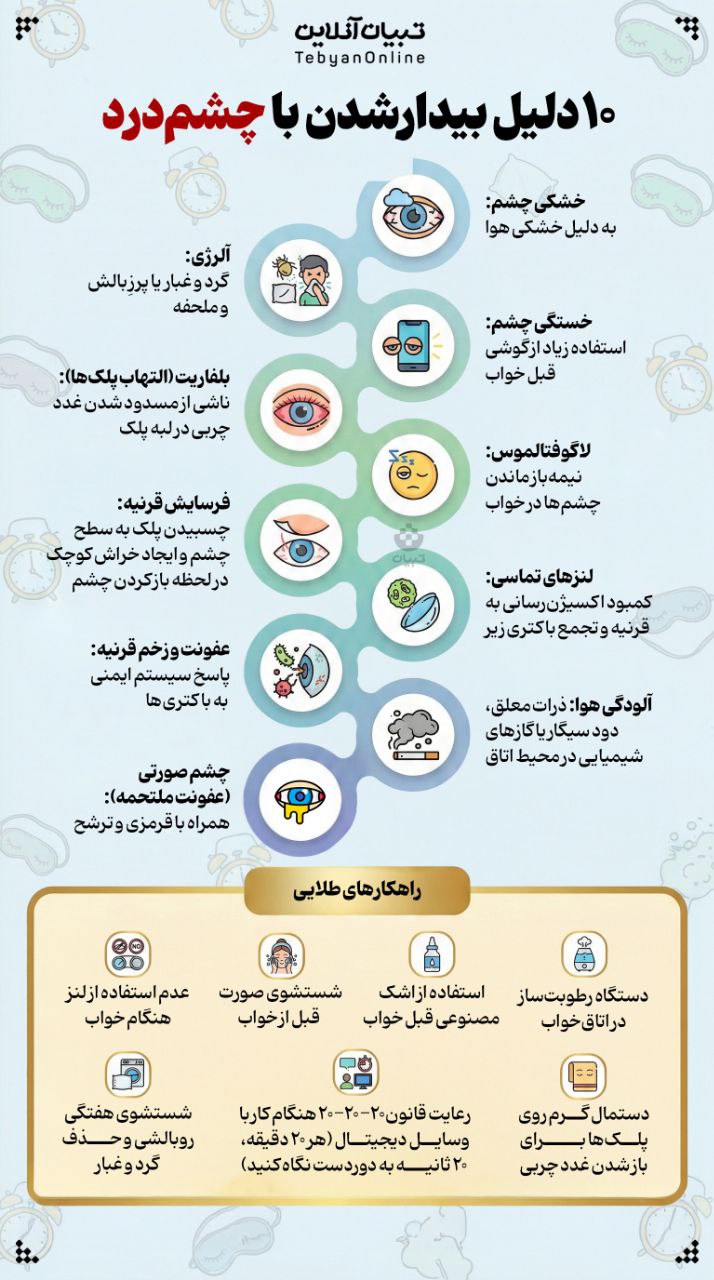 4041124061بیدار شدن با درد چشم، یعنی سطح چشم شما در طول شب به دلایلی آسیب دیده یا خشک شده و با چند تغییر ساده میتونید به رفع این مشکل کمک کنید.