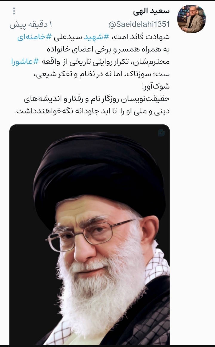 سعید الهی تهیه کننده و منتقد سینمایی نوشت :شهادت قائد امت شهید سید علی خامنه ای به همراه همسر و برخی اعضای خانواده محترمشان، تکرار روایتی تاریخی از واقعه عاشورا ست، سوزناک، اما نه در نظام و تفکر شیعی، شوک آور.