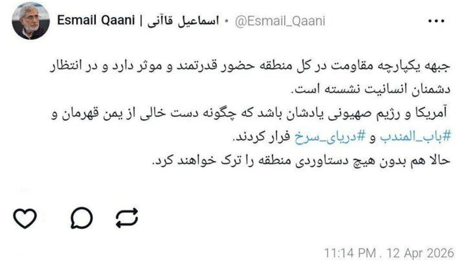 به گزارش ایسنا، سردار اسماعیل قاآنی فرمانده نیروی قدس سپاه پاسداران انقلاب اسلامی در حساب کاربری خود در فضای مجازی نوشت: