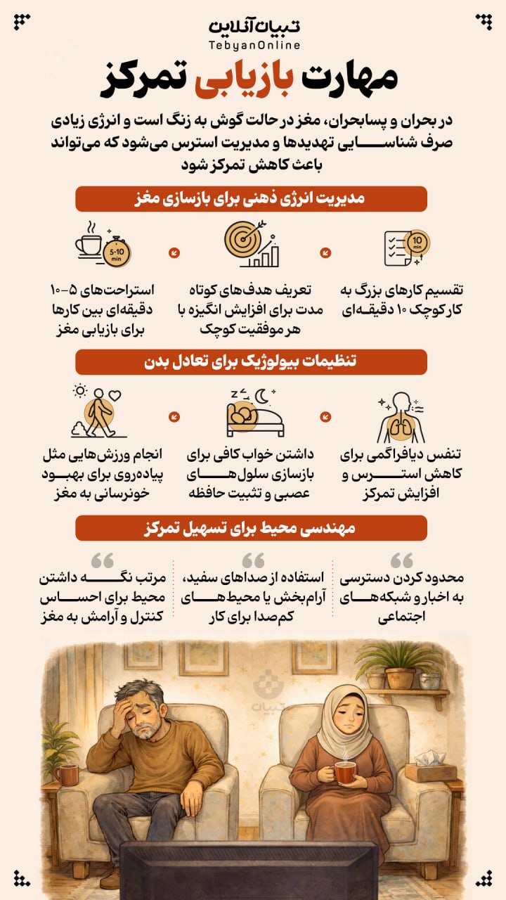 در بحران و پسابحران، مغز در حالت گوش به زنگ است و انرژی زیادی صرف شناسایی تهدیدها و مدیریت استرس میشود که میتواند باعث کاهش تمرکز شود