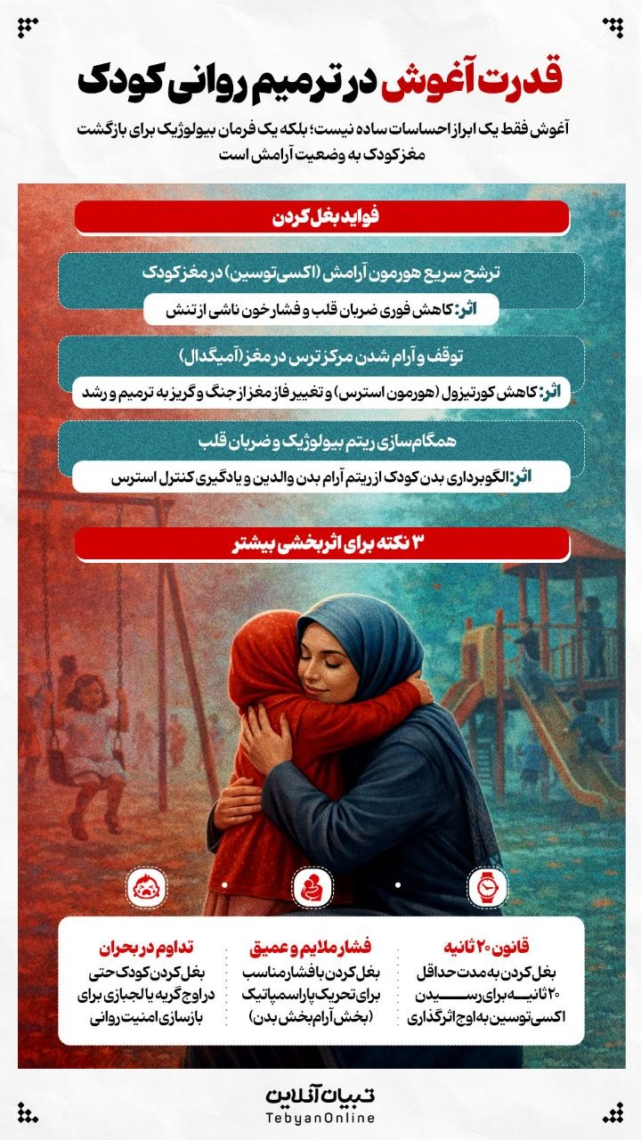 آغوش فقط یک ابراز احساسات ساده نیست؛ بلکه یک فرمان بیولوژیک برای بازگشت مغز کودک به وضعیت آرامش است