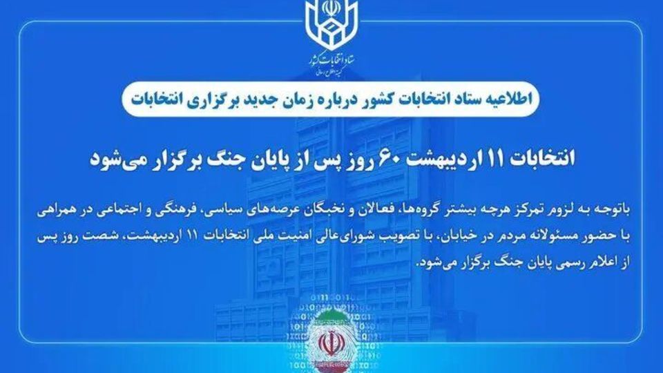 به اطلاع عموم مردم شریف ایران اسلامی می رساند، با عنایت به شرایط خاص و حساس کنونی کشور و ضرورت حفظ انسجام ملی، تقویت همبستگی عمومی و تمرکز هرچه بیشتر گروهها، فعالان و نخبگان عرصههای سیاسی، فرهنگی و اجتماعی در همراهی با حضور مسئولانه مردم در خیابان در راستای پشتیبانی از میدان رزم و رشادت های نیروهای مسلح، درخواست هایی از سوی جریانهای مختلف سیاسی و مسئولان ذیربط مبنی بر تعویق انتخابات تاریخ ۱۴۰۵/۰۲/۱۱ مطرح گردید که این امر طی گزارشهای رسمی به شورای عالی امنیت ملی منعکس شد، بر همین اساس در پاسخ، آن شورا مقرر کرد، انتخابات هفتمین دوره شوراهای اسلامی کشور، اولین میاندورهای ششمین دوره مجلس خبرگان رهبری و میاندورهای دوازدهمین دوره مجلس شورای اسلامی شصت روز پس از اعلام رسمی پایان جنگ توسط شورای عالی امنیت ملی برگزار گردد.