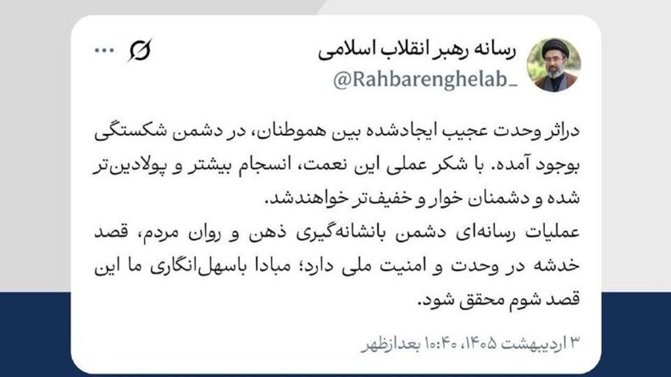 عملیات رسانهای دشمن بانشانهگیری ذهن و روان مردم، قصد خدشه در وحدت و امنیت ملی دارد؛ مبادا باسهلانگاری ما این قصد شوم محقق شود.