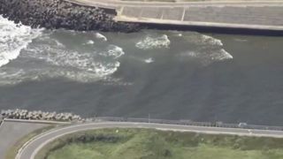 امواج بزرگ دیده شده که در حال بالا آمدن در یک رودخانه در ساحل کوجوکوری، ژاپن هستند.